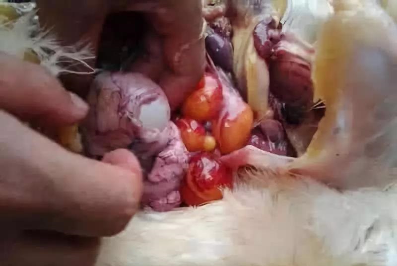 十二指腸黏膜粗糙,內(nèi)附黃油狀物,十二指腸末端腸黏膜上有條狀出血性腫脹。十二指腸及小腸黏膜上有火柴頭及筷子頭大小的出血性壞死性病灶。個(gè)別雞小腸黏膜脫落,腸腔內(nèi)充滿氣體,內(nèi)含未消化的飼料。輸卵管黏膜呈乳黃色,皺褶變厚,內(nèi)分泌物增多,輸卵管下端呈暗紅色,黏膜粗糙。泄殖腔黏膜有點(diǎn)狀或片狀出血,泄殖腔內(nèi)有黃白色、或黃綠色稀糞。盲腸扁桃體腫大,出血性壞死,直腸黏膜有細(xì)砂樣出血點(diǎn)。其他臟器基本正常,僅有個(gè)別病死雞肝臟、脾臟腫大,被膜下有灰白色或灰黃色針鼻大的壞死點(diǎn)。